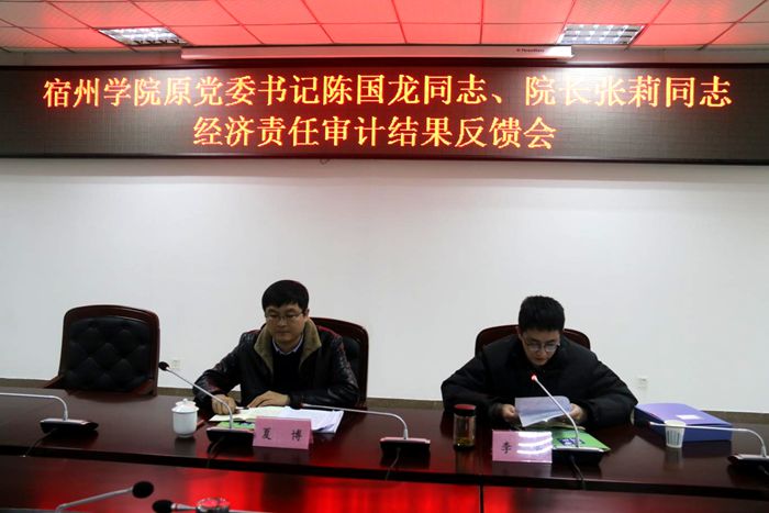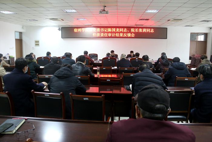 1月4日下午,宿州学院原党委书记陈国龙同志、院长张莉同志经济责任审计结果反馈会在逸夫楼第一会议室召开。审计组组长夏博、主审李易出席会议,院党委书记汪刘送主持会议,院领导班子成员、各部门主要负责人、各二级学院党政主要负责人参加会议。